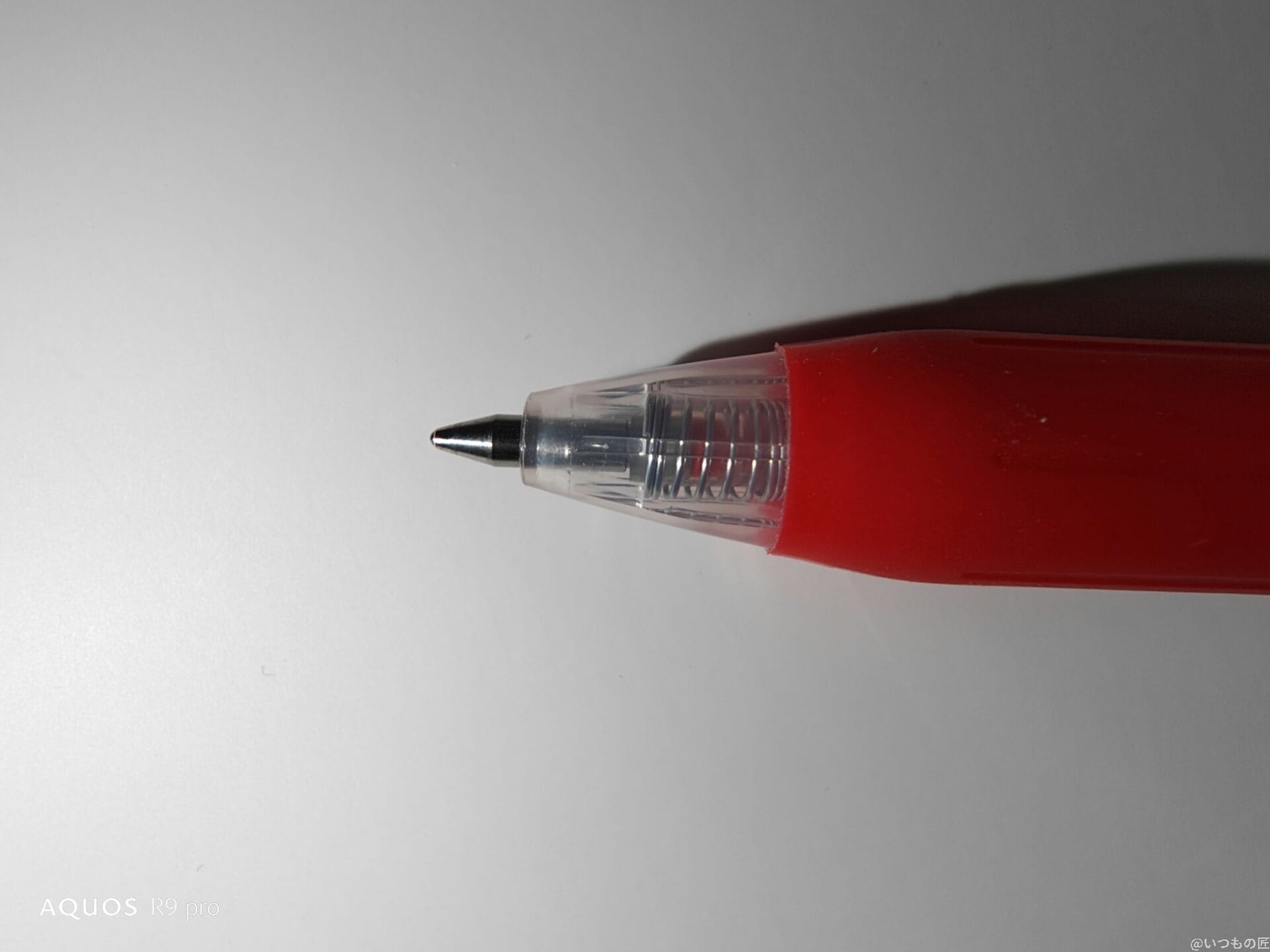 以下は、ボールペンの先にピントを合わせて撮影したマクロ写真です。iPhone 16 Pro MAXと比較したところ、AQUOS R9 proは輪郭がくっきりきれいに撮れています。