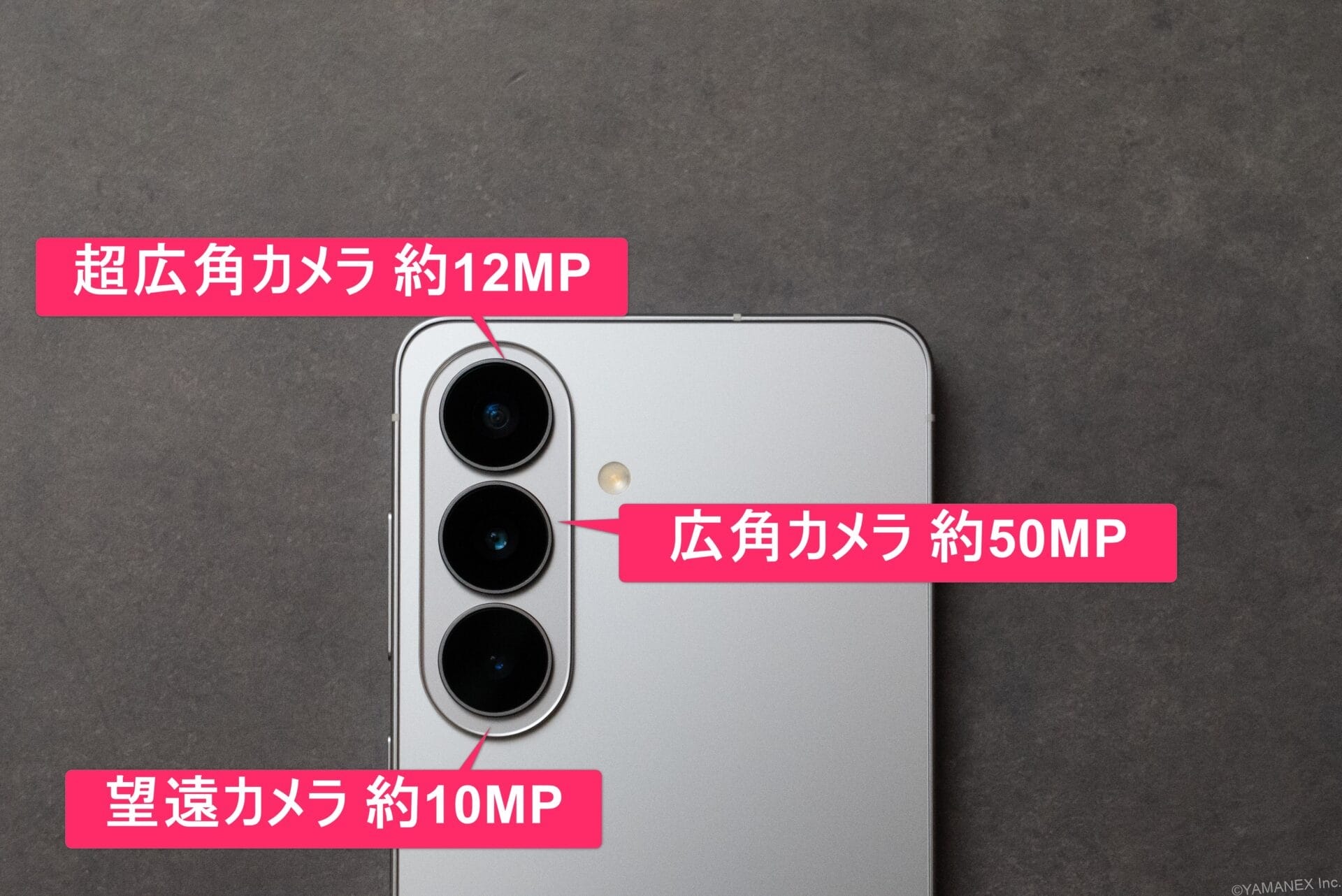Galaxy S26のカメラ構成は、約50MPの広角カメラ、約12MPの超広角カメラ、約10MPの望遠カメラを組み合わせたトリプルカメラです。コンパクトなボディながら、日常のスナップから風景、遠くの被写体まで幅広く撮影できます。