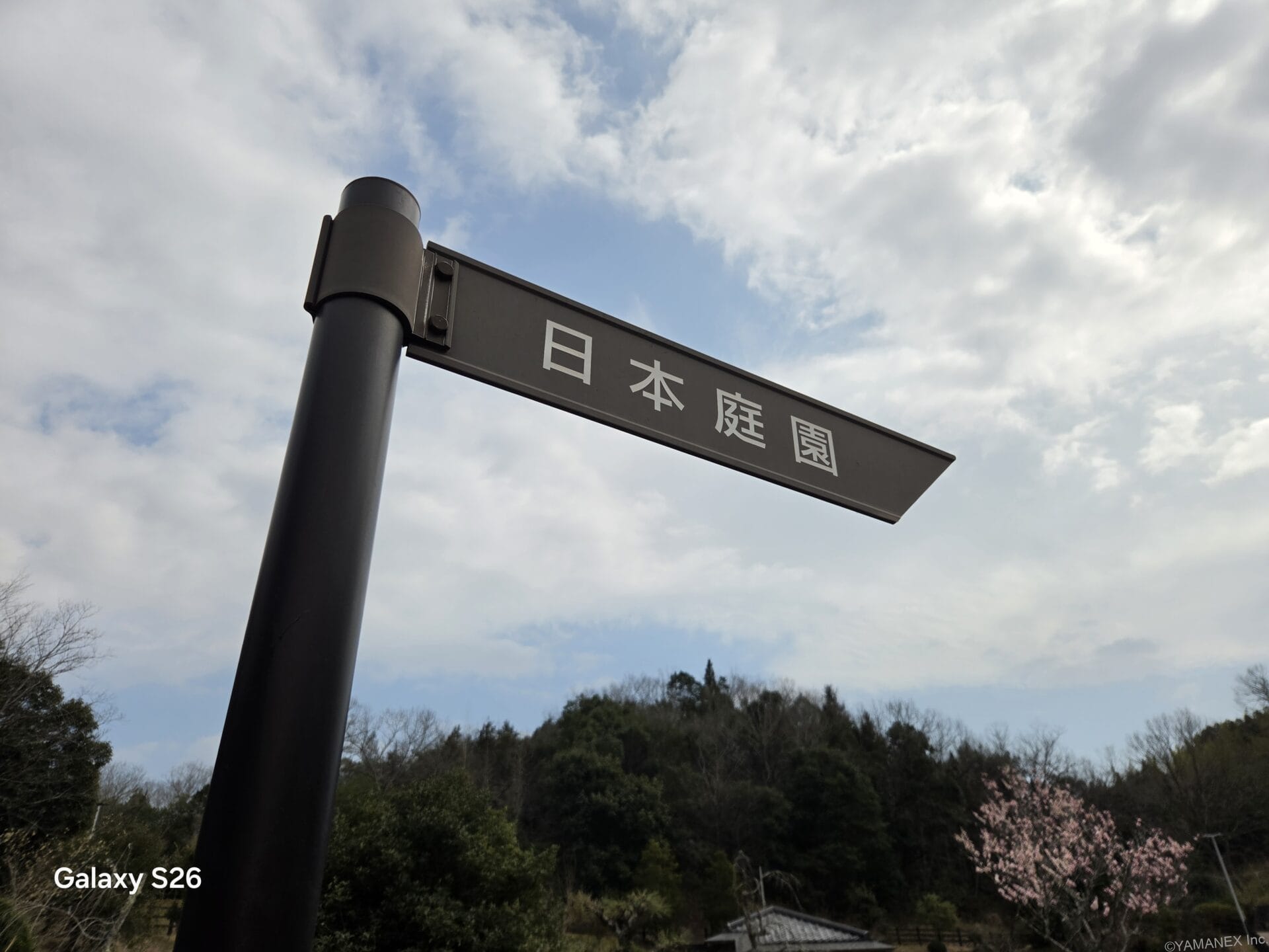 Galaxy S26 カメラ 「日本庭園」と書かれた道標を撮影
