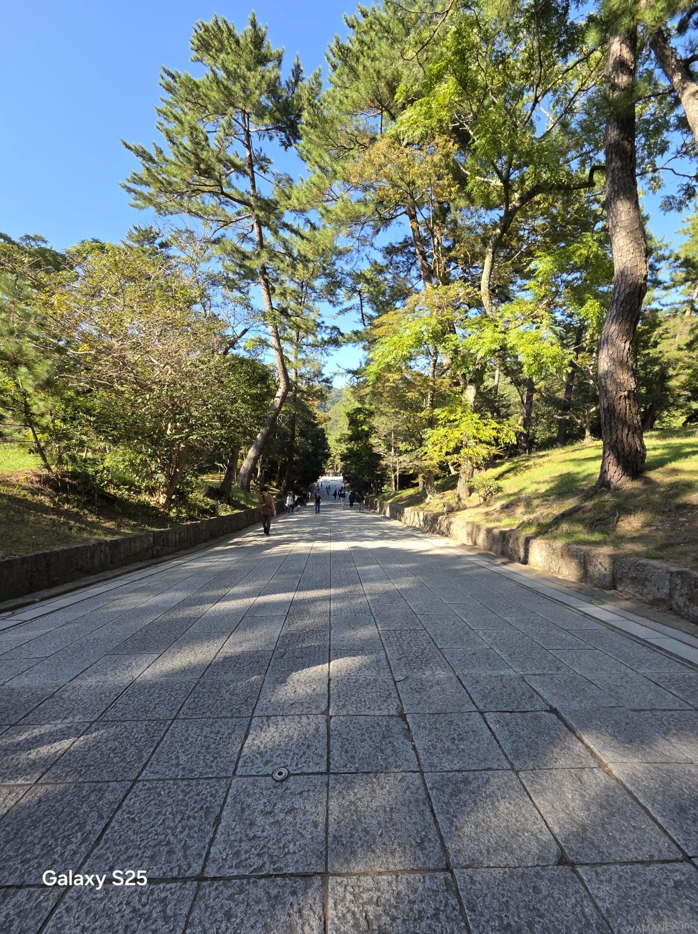 Galaxy S26 カメラ 緑の木々が生い茂る並木道