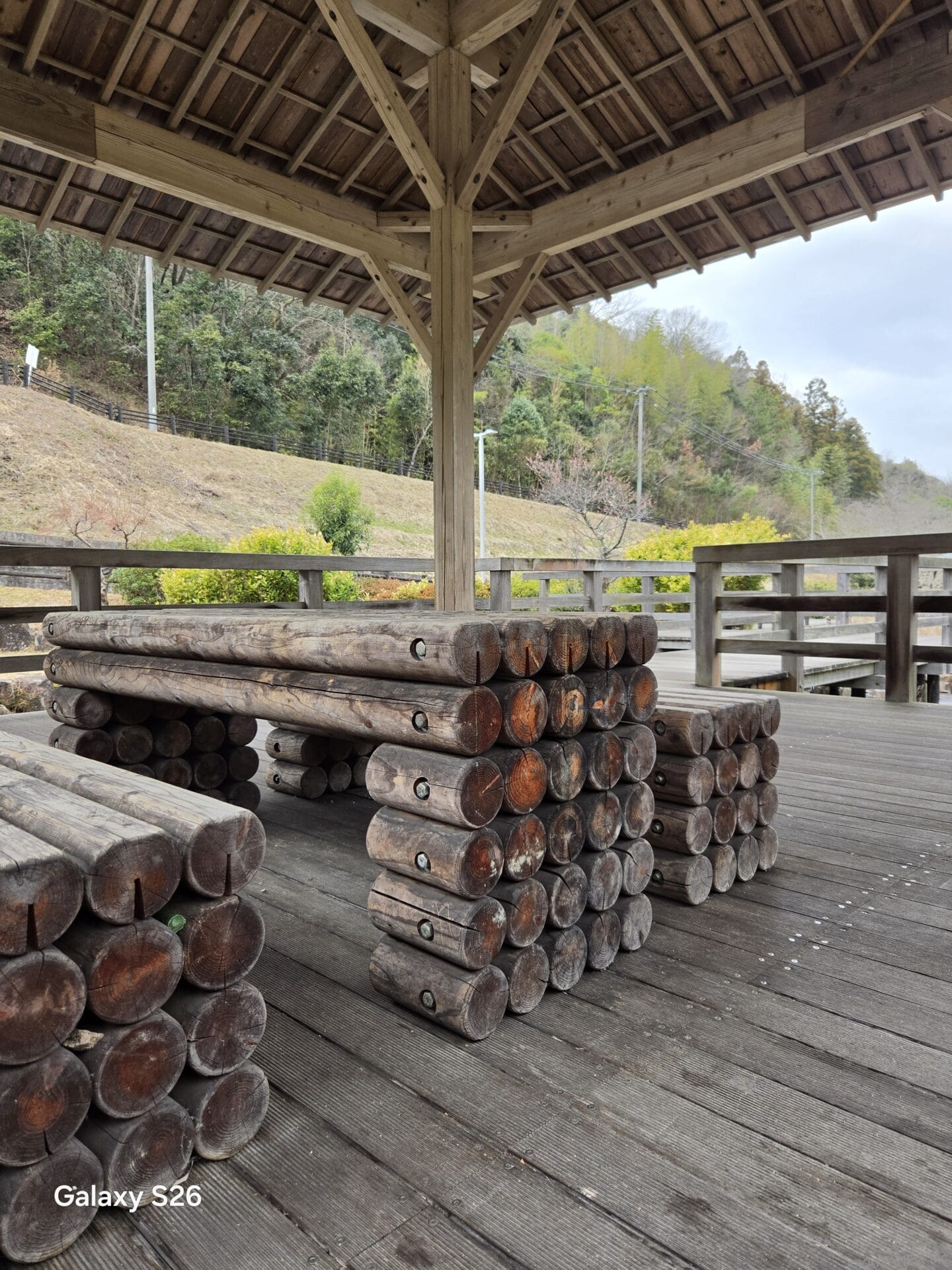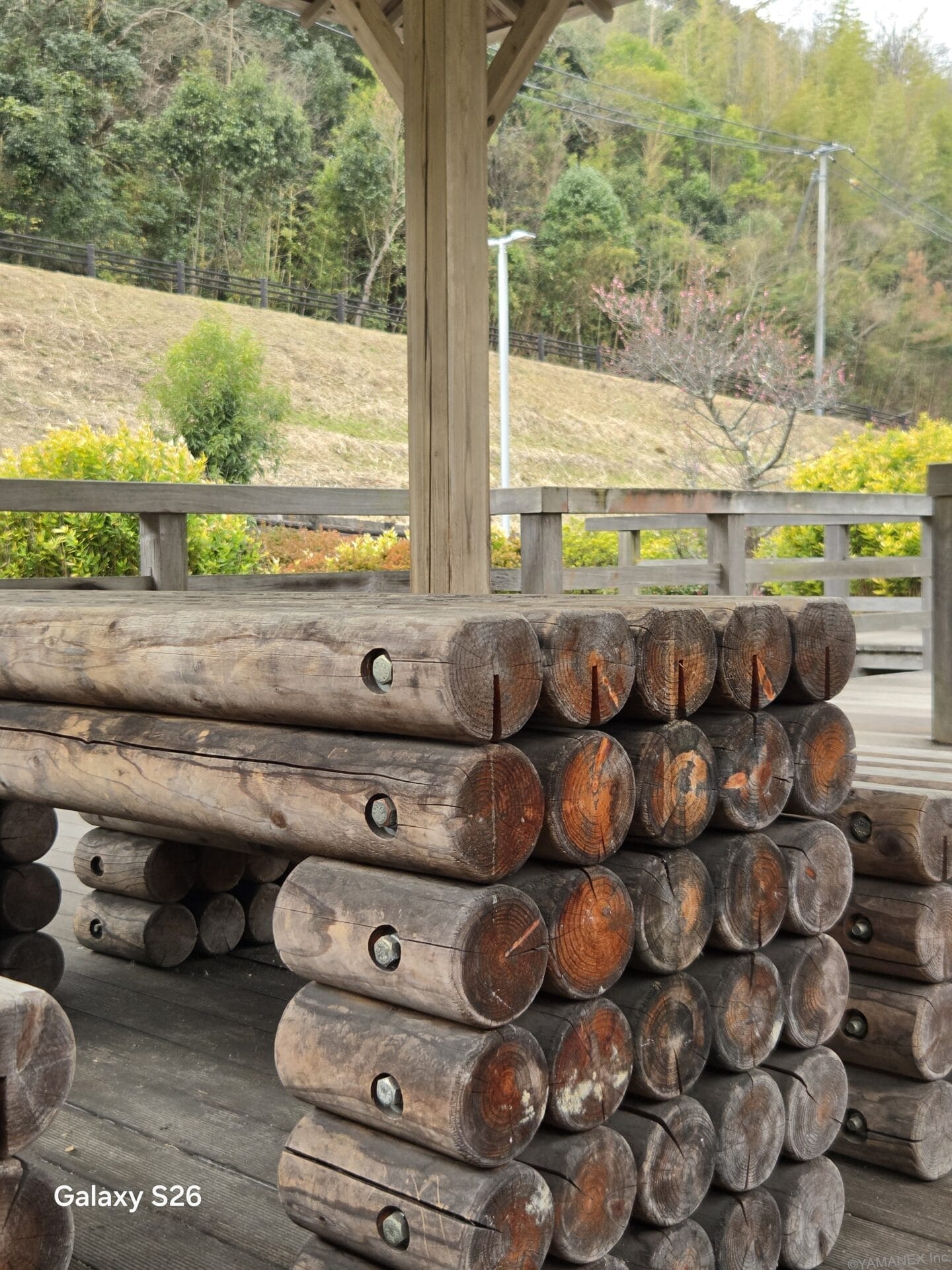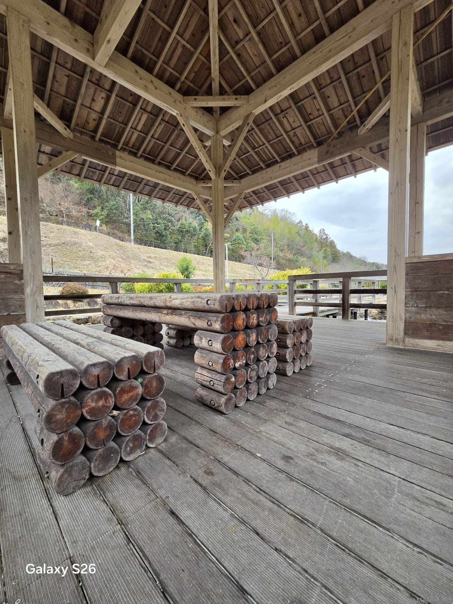 Galaxy S26 カメラ 木造の休憩小屋を撮影