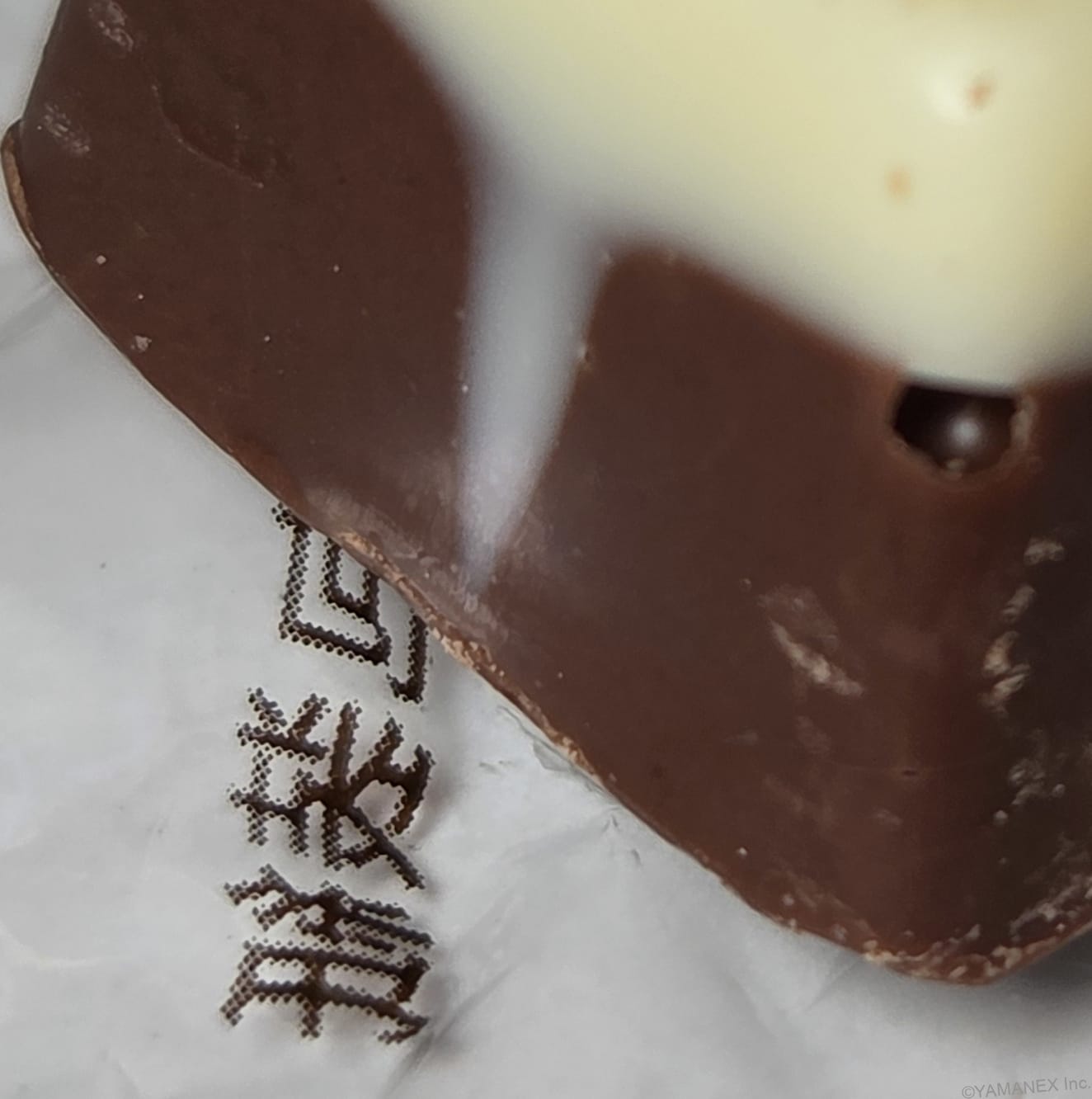 以下はチョコレートをマクロ撮影した写真です。包装紙の文字部分にピントが合ってしまい、チョコレートが全体的にぼやけています
