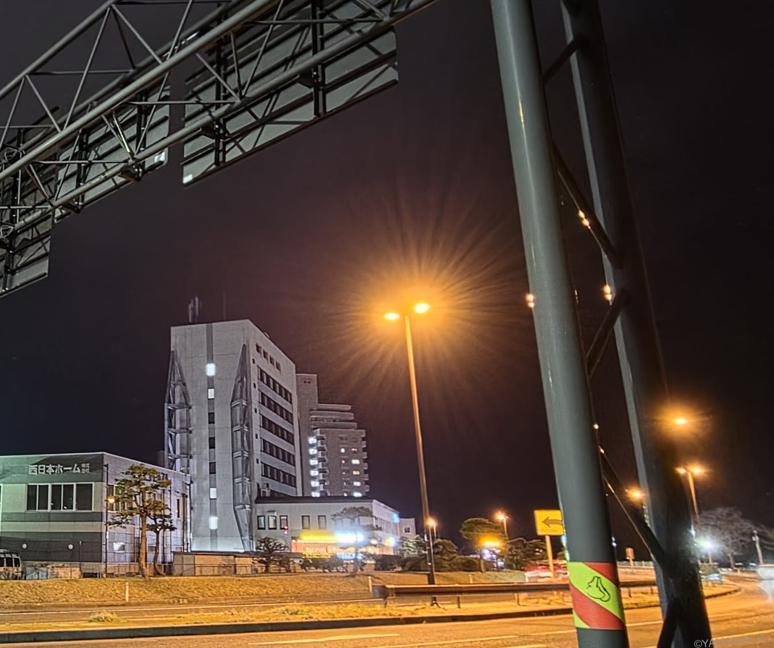 以下は、Galaxy S26のカメラで暗所かつズーム撮影した写真です。比較的明るいシーンでは、0.6倍から3倍ズームまでブレやにじみなどの劣化を抑えられています。しかし、街灯の灯りが拡散され、白いもやがかかっているように見えます