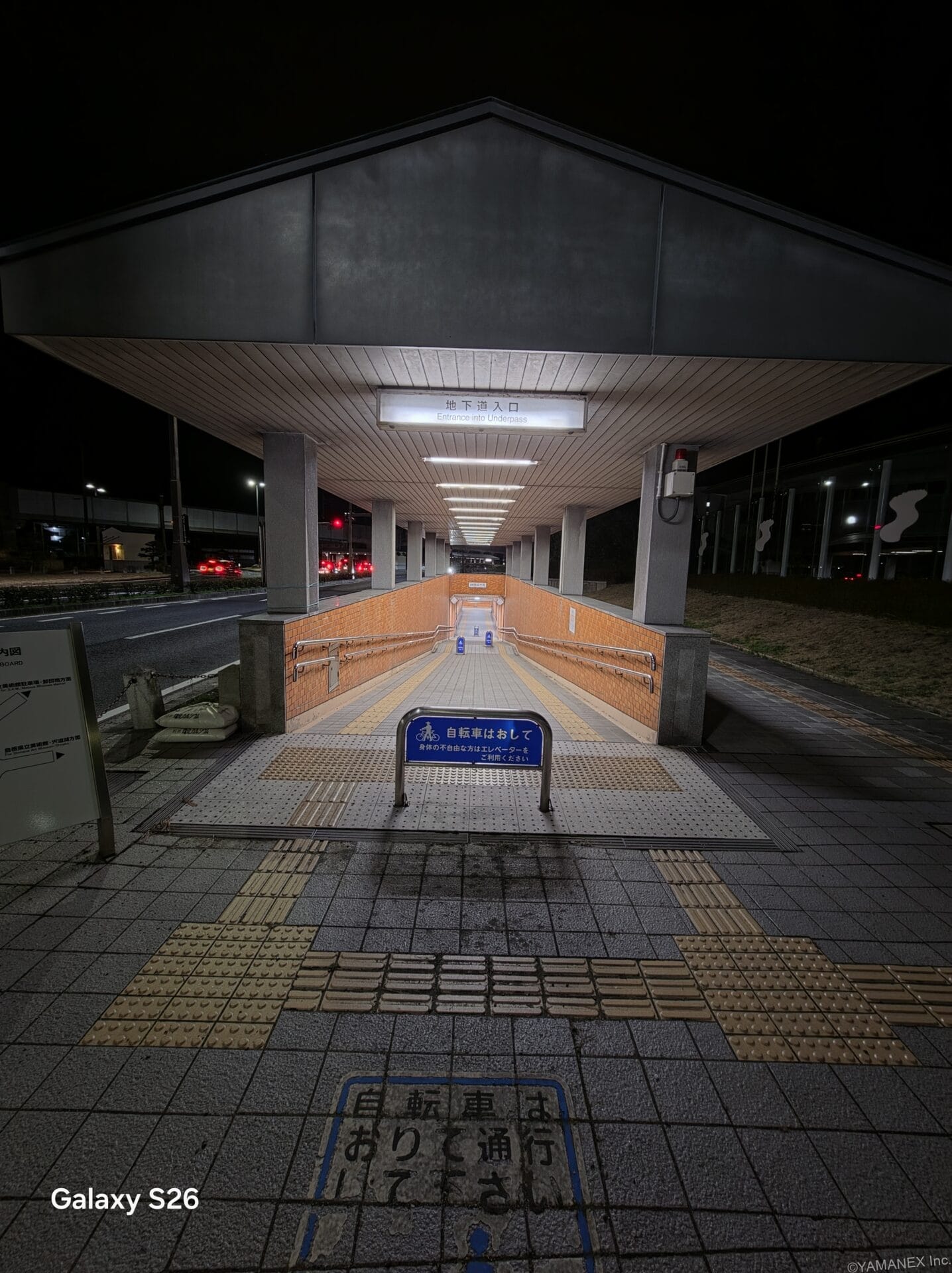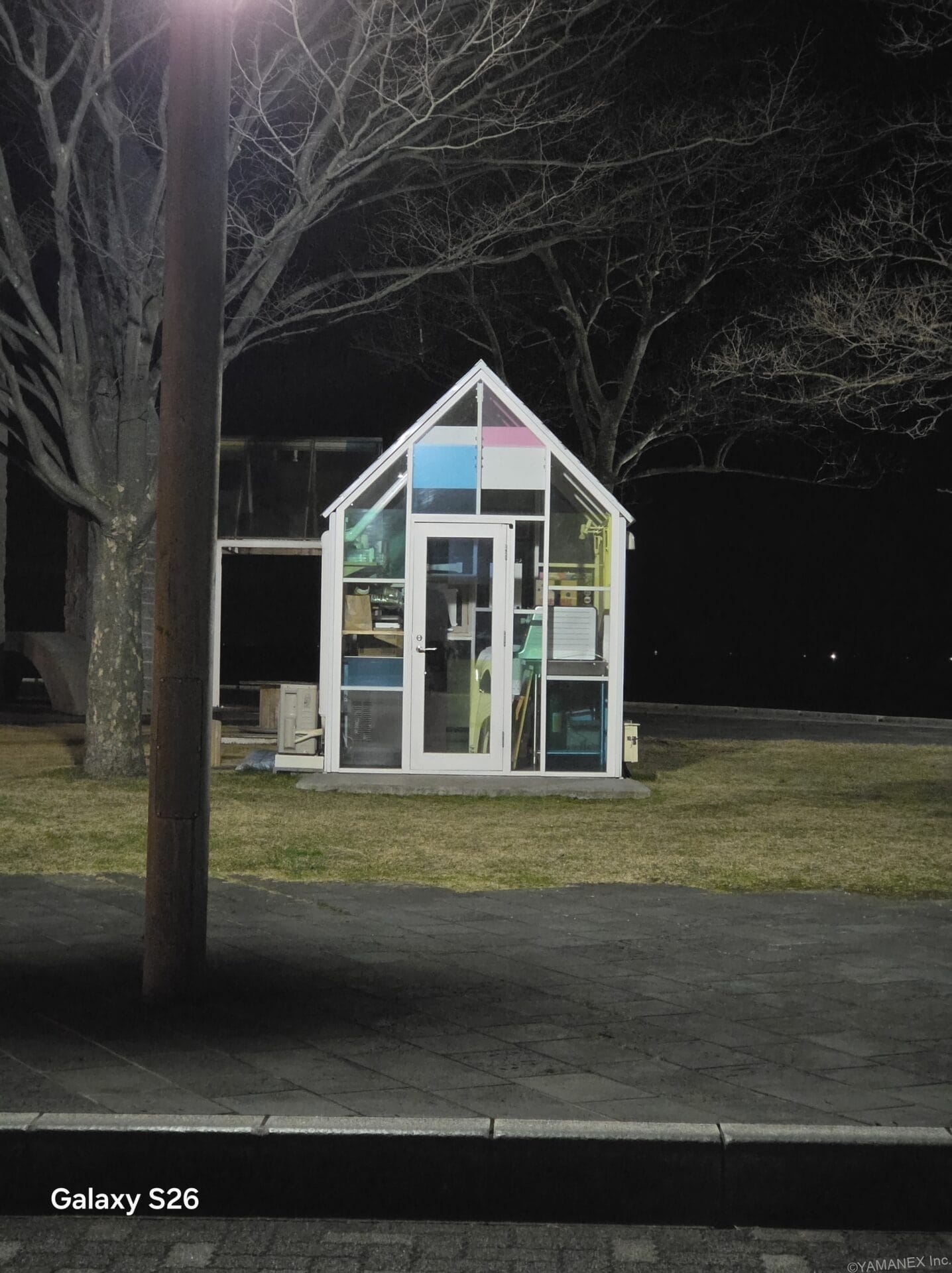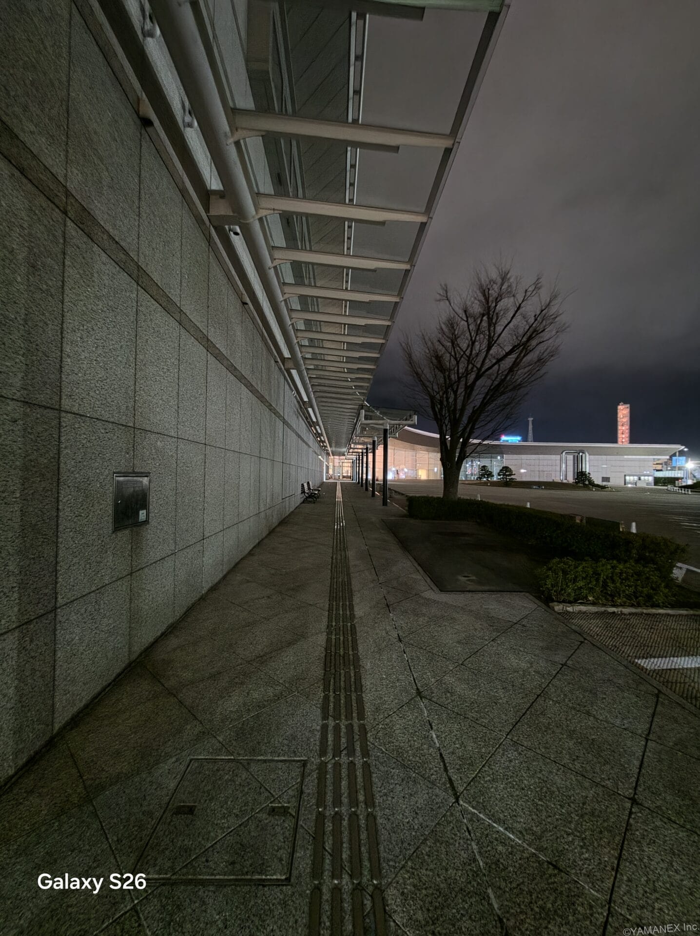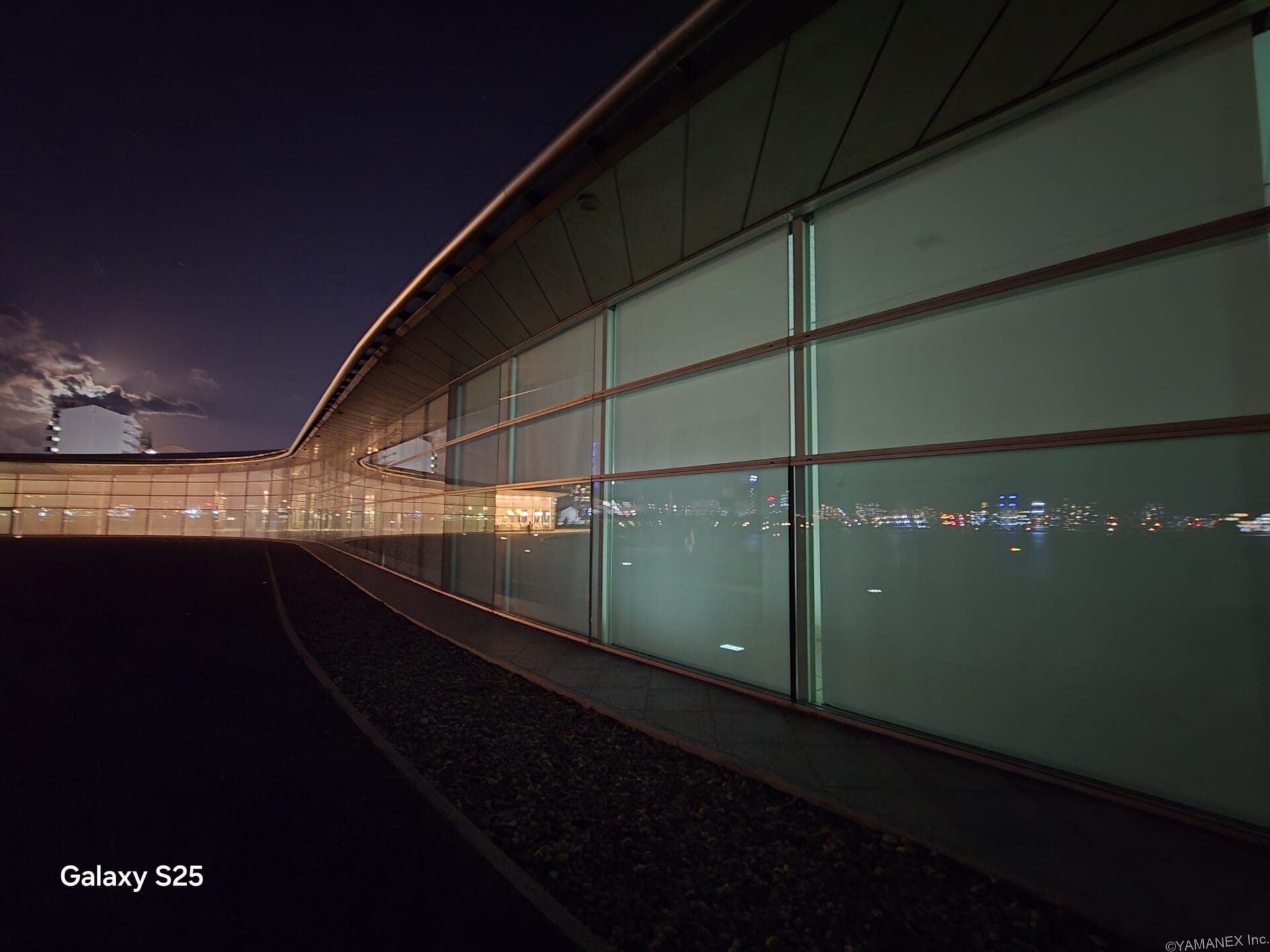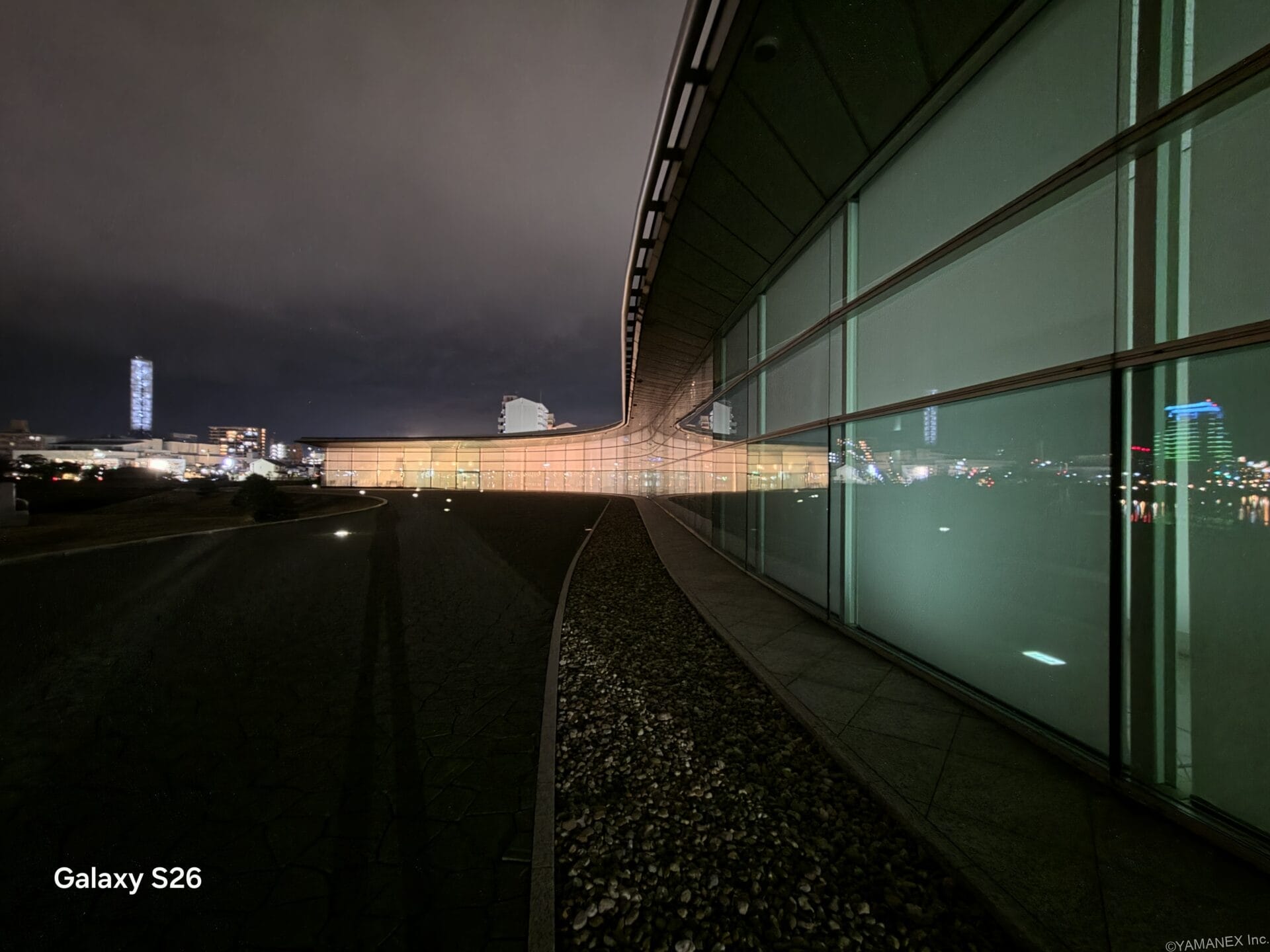 Galaxy S26 カメラ ガラス張りの通路を夜間撮影