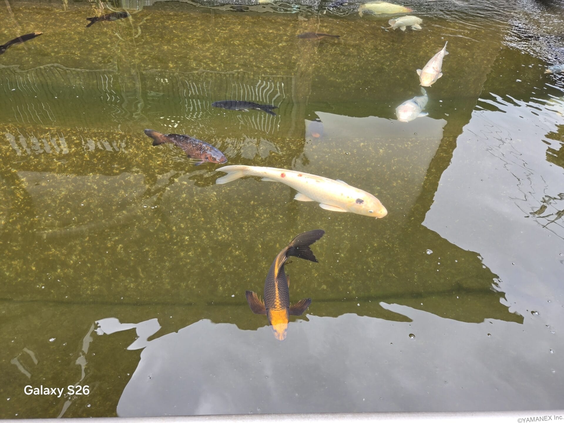 Galaxy S26のカメラは、以下のような美しい風景写真が撮れます。作例1では、カラフルな看板を明るく色鮮やかな一枚に仕上げています。作例2では、曇天のシーンでも黒つぶれを抑え、小さな桜の花の様子を際立たせて撮影できました。作例3では池の鯉もしっかり捉え、幻想的な一枚に仕上げています。