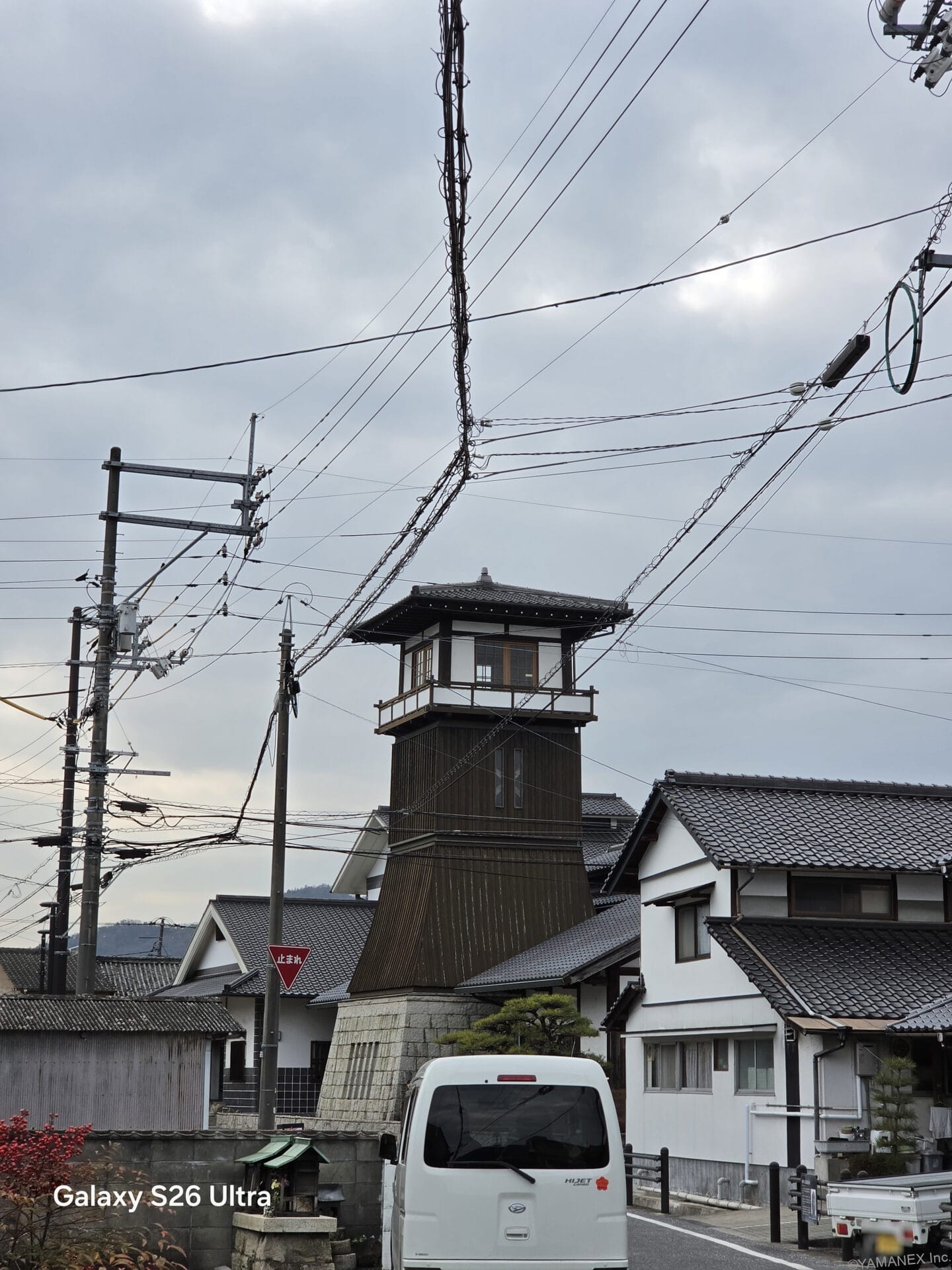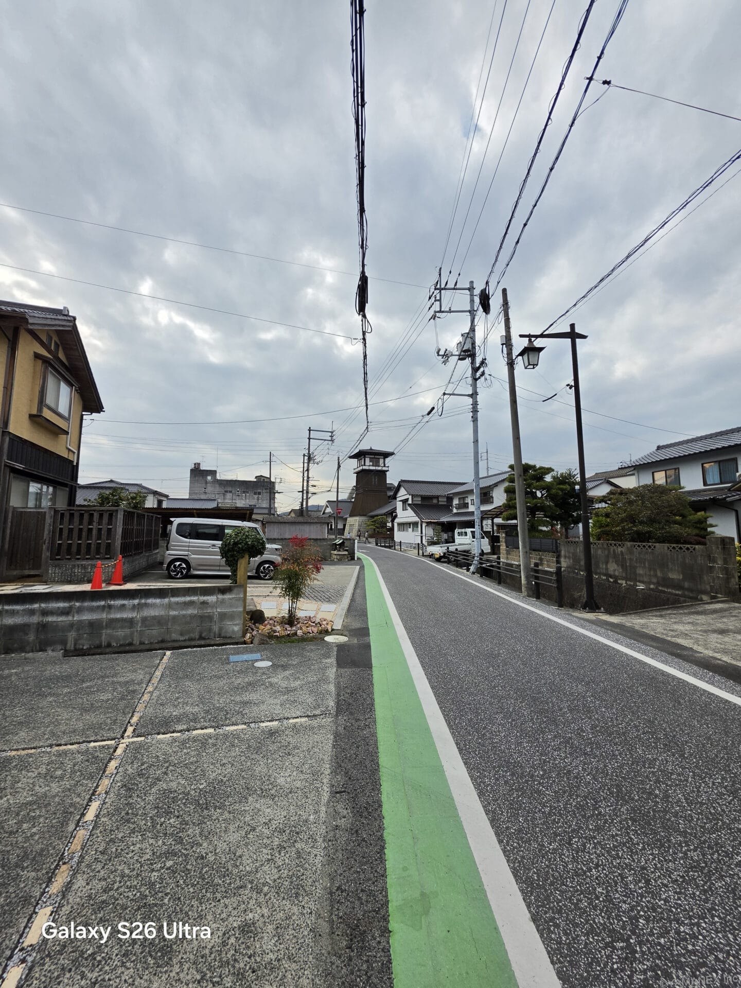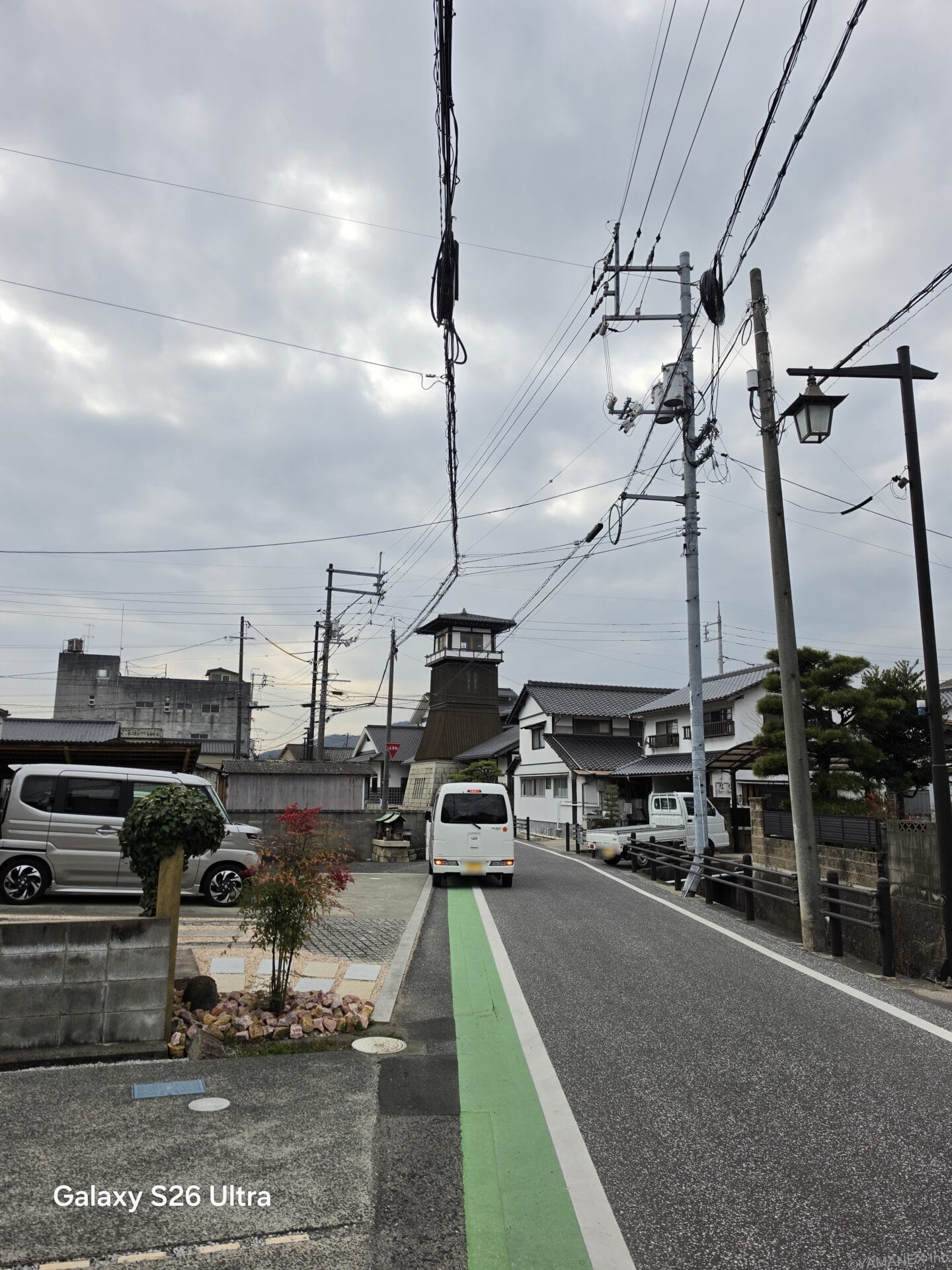 曇天時のやや暗めなシーンのズームでも、暗くなりすぎずちょうど良いバランスで撮影できています。道路の様子や道沿いに並ぶ家の瓦屋根など、細部までしっかり描写できています。