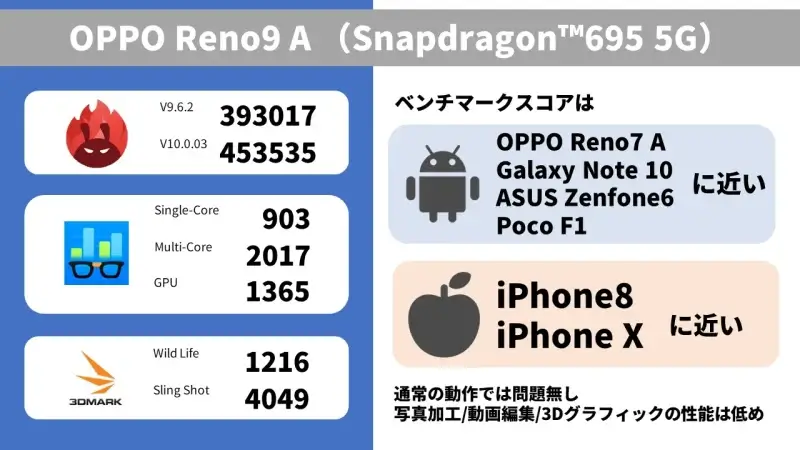 OPPO Reno9 Aはミドルクラスの価格帯でワンランク上の体験を提供するを、OPPO社がコンセプトに掲げています。それを裏付ける処理性能は以下のスペックです。